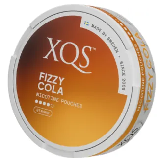 XQS Fizzy Cola Strong har en tydligt syrlig och söt smak av cola med en inslag av vanilj och kommer i slimmade och starka portioner. Nikotinstyrkan ligger på 20 mg nikotin per gram.